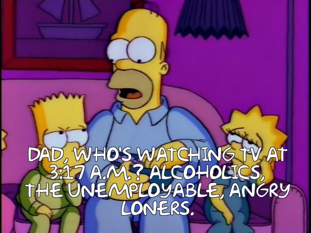 several times these late night repeats get interrupted by the news. ya know – the “what did the nacho cheese dorito in chief fuck up today” show. but then, they don’t play the episode in its entirety when this happens. they join it “already in progress” so you miss big chunks of subplot or what have you. why do that? read the room! who the fuck is watching tv that late?
