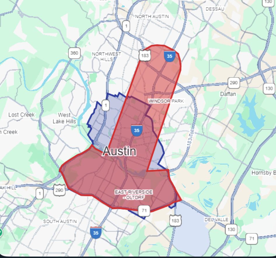 …i see them constantly around my friday route, and those driverless fuckers are some of the most courteous drivers in downtown austin. but elon’s gonna elon, so he had to bring his bullshit taxi service to austin, and had to have the bigger coverage map. tesla in red (of course), waymo in blue. i’m sure the shape of his coverage plan is purely coincidence…