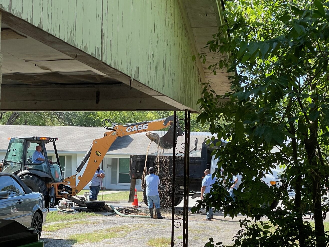 i noticed when i went and got dinner thursday night there was a puddle in front of the house at the base of the driveway, but we hadn’t had any rain in a bit. i just kinda wrote it off, went and got our food, came home, and that was all she wrote. the next morning after my “morning constitutional” i flushed but the water was lightly tinted brown (the “fresh water” out of the tank, that is – no “remainders”) so i flushed again and it got DARKER. slowly got worse with each flush, so i just warned nik not to let the dogs drink out of the toilet and walked outside to leave for work, only to hear what sounded like a slightly distant babbling brook and…